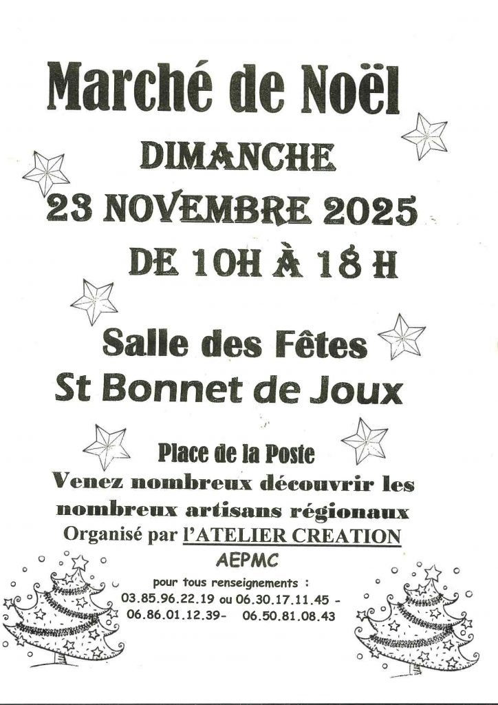 marché de Noël à la salle des fêtes de Saint Bonnet de Joux de 10h00 à 18H00.