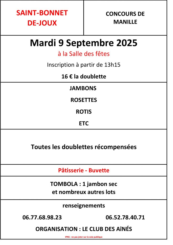 le mardi 09 septembre 2025 à la salle des fêtes de Saint Bonnet de Joux à partir de 13h15