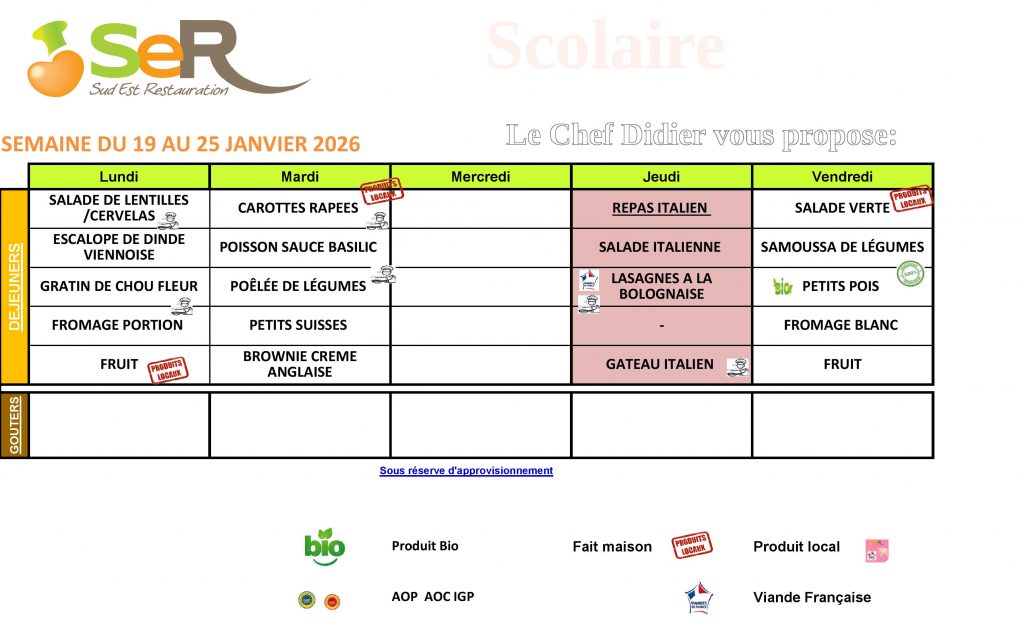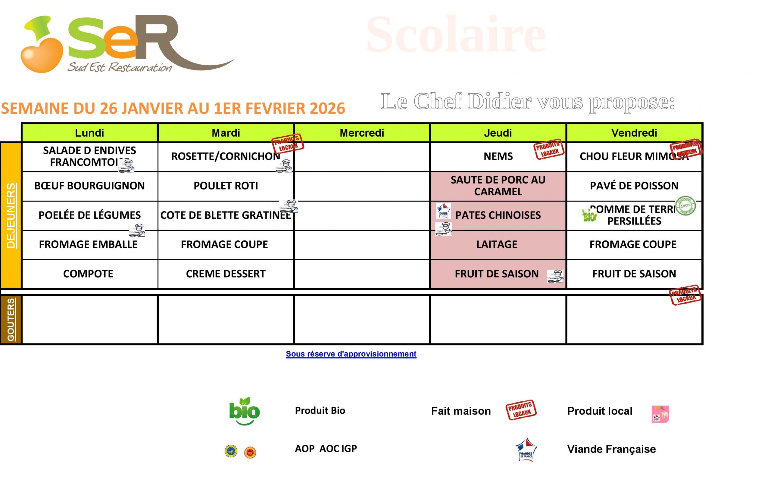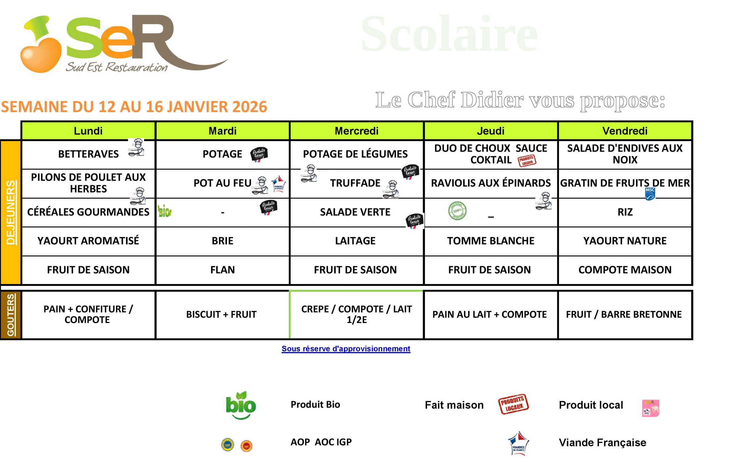 Vous trouverez ci-dessous les menus du restaurant scolaire pour la période du 12/01/2026 au 30/01/2026